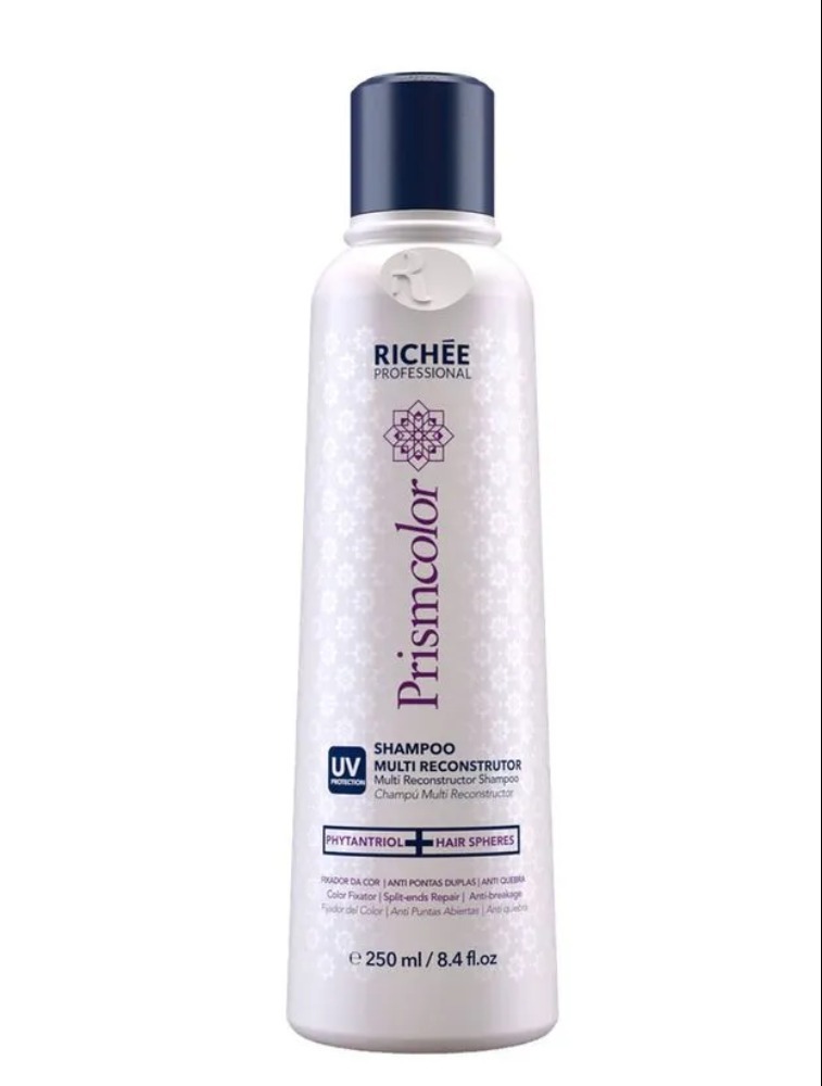 Richée Professional Prismcolor Shampoo Multi Reconstrutor - Prismcolor Shampoo Multi Reconstrutor limpa os cabelos quimicamente tratados, coloridos, descoloridos ou com mechas, recuperando a vitalidade e devolvendo o movimento, brilho e a vivacidade da cor - Formulado com Proteína do Arroz, Queratina Vegetal e Pró Vitamina B5, que previne o surgimento de pontas duplas nos fios, além de combater o desbotamento dos cabelos, preservando a coloração por mais tempo - Tecnologia à base de Phytantriol, composto que intensifica os efeitos do Pantenol e da Queratina, proporcionando uma profunda multi reconstrução capilar até o córtex, e Hair Spheres, esferas com múltiplas camadas de ativos altamente concentrados que penetram com mais eficiência na fibra capilar, com efeito gradual e de longa duração. Indicação Cabelos coloridos, descoloridos ou com mechas. Modo de uso Nos cabelos úmidos, aplique o Prismcolor Shampoo Multi-Reconstrutor e massageie delicadamente até formar espuma,enxaguando completamente em seguida. Reaplicar se necessário.