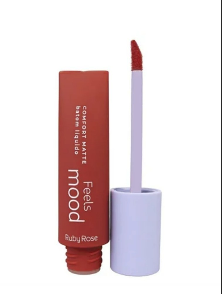 O Batom Líquido Ruby Rose Feels Mood Comfort Matte tem textura leve e hidratante, que desliza sem esforço nos lábios, deixando uma cor intensa e uma sensação aveludada e confortável o dia todo, sem ressecar ou craquelar.