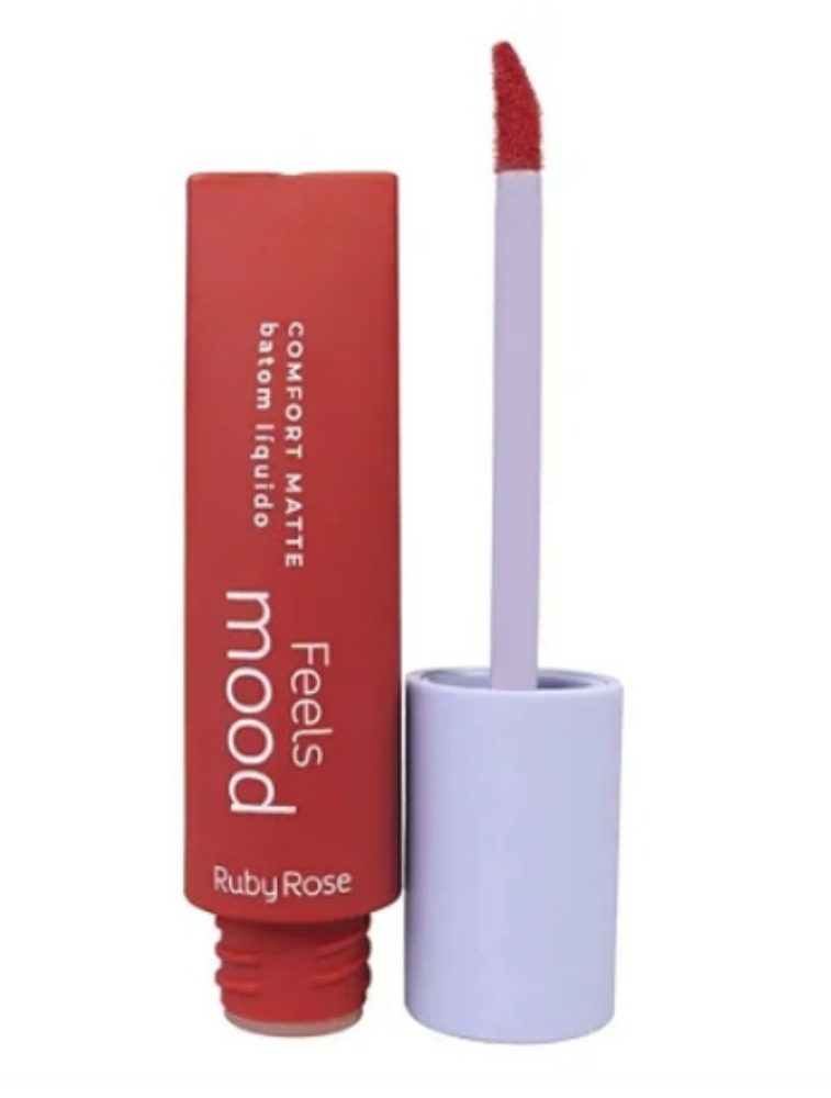 O Batom Líquido Ruby Rose Feels Mood Comfort Matte tem textura leve e hidratante, que desliza sem esforço nos lábios, deixando uma cor intensa e uma sensação aveludada e confortável o dia todo, sem ressecar ou craquelar.