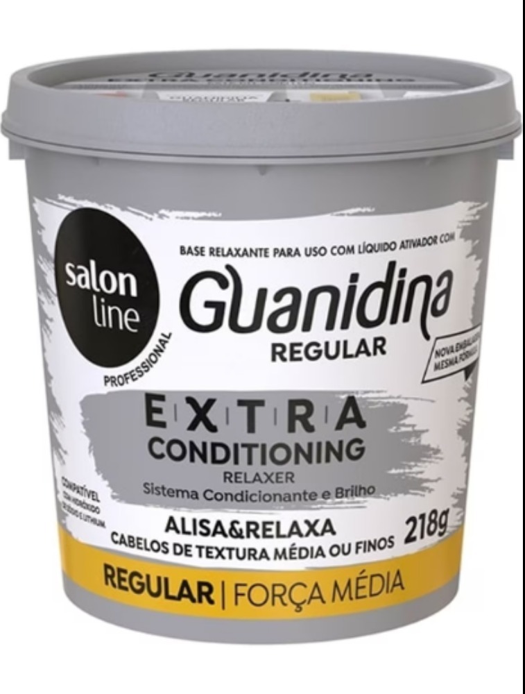 Salon Line Guanidina Extra Conditioning alisa, relaxa e reduz o volume dos cabelos, deixando-os mais lisos e soltos. Sua fórmula proporciona um resultado rápido e eficiente, além de conter Extrato de Pequi, Óleo de Algodão e Óleo de Babaçu, que promovem máximo condicionamento, brilho e maciez, além de hidratar e nutrir.A Guanidina é compatível com Hidróxido de Sódio e Lithium, e incompatível com Tioglicolato de Amônia. Cuidado com colorações que contenham Amônia.