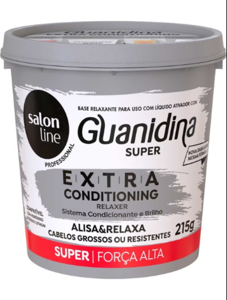 Salon Line Guanidina Extra Conditioning alisa, relaxa e reduz o volume dos cabelos, deixando-os mais lisos e soltos. Sua fórmula proporciona um resultado rápido e eficiente, além de conter Extrato de Pequi, Óleo de Algodão e Óleo de Babaçu, que promovem máximo condicionamento, brilho e maciez, além de hidratar e nutrir.A Guanidina é compatível com Hidróxido de Sódio e Lithium, e incompatível com Tioglicolato de Amônia. Cuidado com colorações que contenham Amônia.