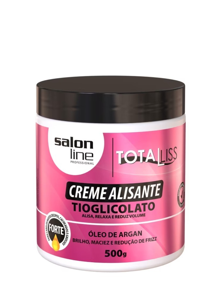 - Contém Sais de Ácido Tioglicólico, Alcali e Amônia. Cabelos que passaram por tinturas progressivas, que foram descoloridos com água oxigenada 30 ou 40 volumes, ou que foram tratados com outras químicas cujo princípio ativo não seja o tioglicolato, tais como hidróxido de sódio, hidróxido de lithium, magnésio, henê, guanidina, henna, descoloração, hidróxido de potássio e sais metálicos, não podem ser submetidos ao uso do Salon Line Creme Alisante com Óleo de Argan. O uso deste produto só é possível quando os cabelos crescerem e estiverem em seu estado natural, sem qualquer resíduo das químicas mencionadas acima.