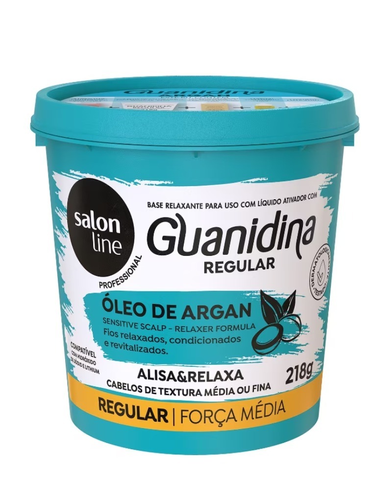 Salon Line Guanidina Óleo de Argan alisa, relaxa e reduz o volume dos cabelos, deixando-os mais lisos e soltos. Sua fórmula proporciona um resultado rápido e eficiente, além de conter Óleo de Argan, que promove brilho e maciez aos fios. A Guanidina é compatível com Hidróxido de Sódio e Lithium, e incompatível com Tioglicolato de Amônia. Cuidado com colorações que contenham Amônia.