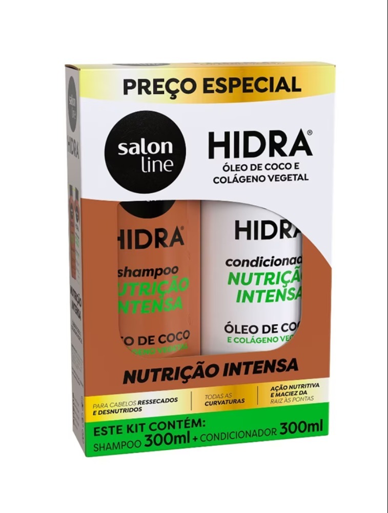 O kit com Shampoo e o Condicionador Hidra Nutrição Intensa limpa, desembaraça, hidrata e nutre profundamente os fios, garantindo saúde e brilho ao cabelo.