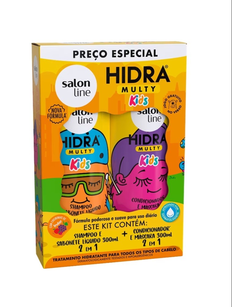 O Kit Hidra Multy Kids traz benefícios e praticidade para os pais e seus pequenos. Além disso, os produtos são seguros e multifuncionais para ajudar na rotina corrida do dia a dia. O Shampoo e o Condicionador Multy Salon Line tratam dos cabelos e do corpo das crianças.
