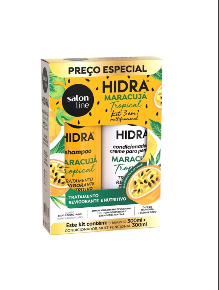 Kit de Shampoo e Condicionador 3 em 1 Multifuncional Hidra Maracujá Tropical garante tratamento revigorante e nutritivo, além de fios supermacios e com brilho. É ideal para a etapa de nutrição do cronograma capilar e possui cheirinho delicioso de maracujá.