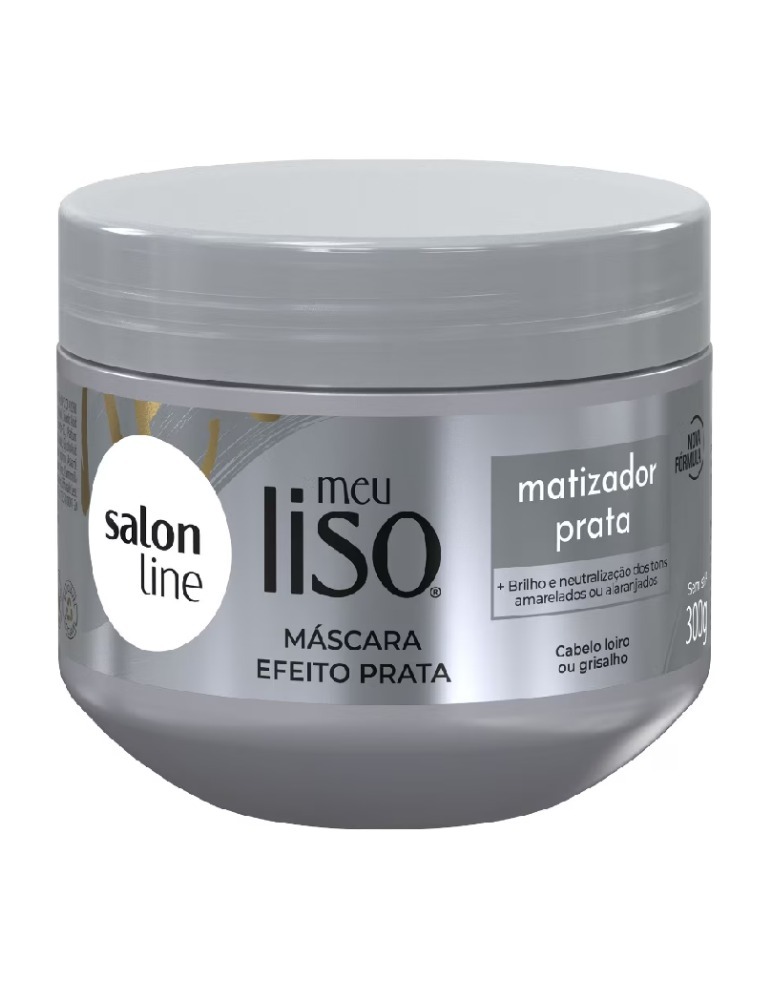 A Máscara Meu Liso Matizador Prata elimina o tom amarelado dos cabelos brancos, loiros acinzentados descoloridos ou naturais, além de hidratar e desembaraçar, garantindo efeito profissional aos fios.