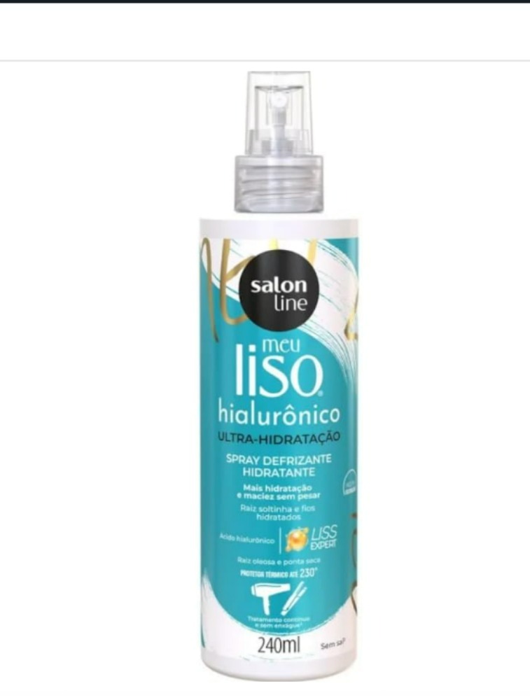 Quais os principais ativos? O Spray Defrizante Protetor Térmico Meu Liso Hialurônico conta com ácido hialurônico que garante restauração capilar, reposição de massa e controle do frizz.