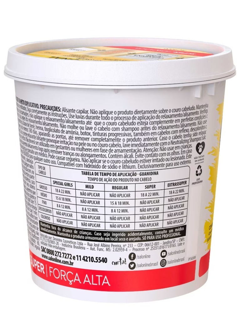 A Guanidina Super Alisa e Relaxa possui fórmula que garante fios relaxados, condicionados e revitalizados. Compatível com hidróxido de sódio e lithium. Uso profissional.