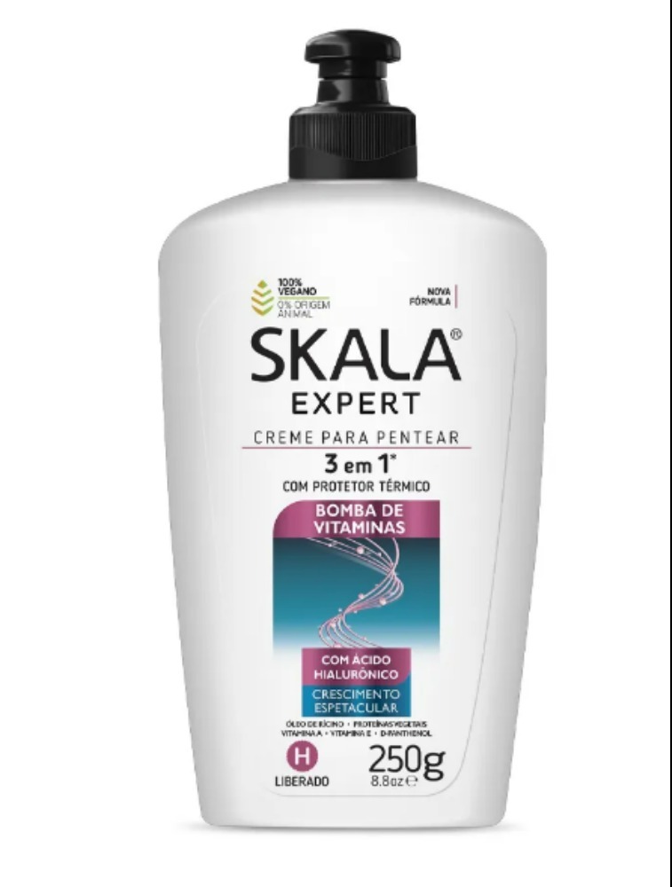 O Creme De Pentear Skala 3 em 1 Bomba De Vitaminas 250g possui uma fórmula exclusiva com ingredientes ricos em nutrientes poderosos, que auxiliam na saúde dos fios e promovem um efeito radiante nos fios, preenchendo as áreas danificadas, proporcionando brilho intenso. Protege e restaura a elasticidade dos fios, auxilia no crescimento saudável dos fios, ajuda a manter os fios saudáveis, previne a queda dos fios e promove força e hidratação. Além disso, protege do calor do secador, difusor e chapinha, forma uma película ao redor da fibra capilar, protegendo-a de altas temperaturas (até 230 graus).