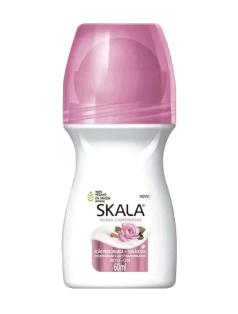 Desodorante roll-on antitranspirante. Skala Rosas e Amêndoas protege as axilas por tempo prolongado, sem danificar a pele.