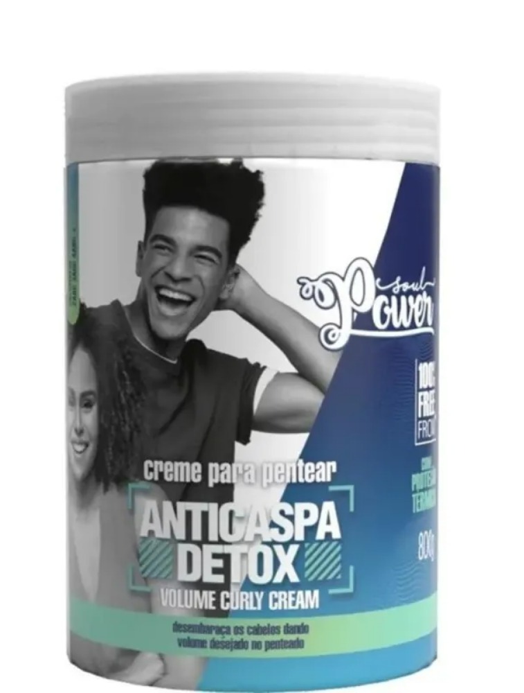 Creme de pentear anticaspa para cabelos cacheados, crespos ou ondulados.. Soul Power Anticaspa Detox desembaraça e garante volume.
