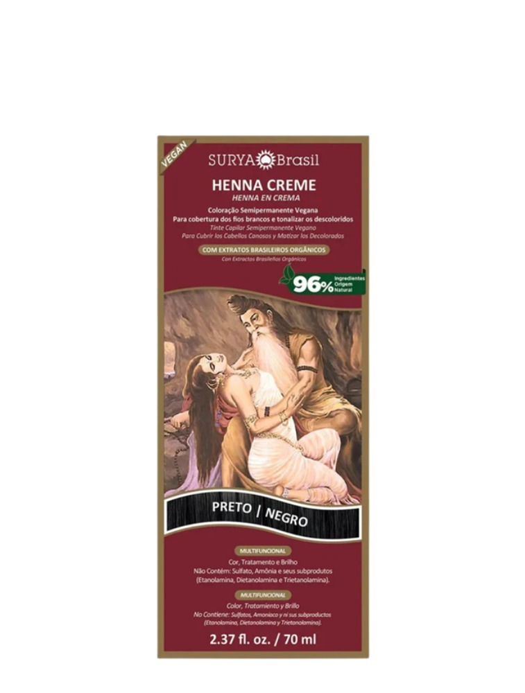 A Henna Creme Preto 70ml Surya Brasil, é a coloração mais natural e com melhor performance, unindo os melhores ingredientes da Índia e da floresta Amazônica. Formulada com um blend exclusivo, composto por 15 Extratos Vegetais e Orgânicos que tratam e hidratam os fios, deixando-os mais macios e sedosos. Dermatologicamente testado.