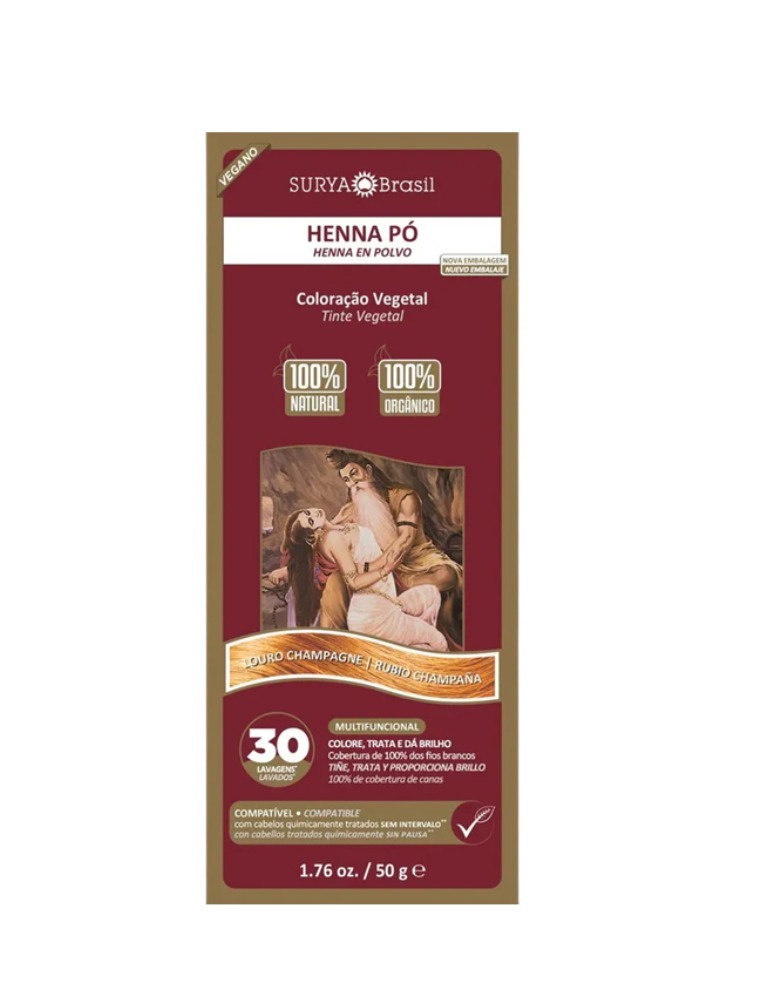 A Henna Pó louro Champagne 50g Surya Brasil é formulada com 100% de ingredientes vegetais e orgânicos. Aliados aos princípios da Ayurveda, é o tratamento completo para os fios. Além de colorir os cabelos e tonalizar os descoloridos, é a opção mais saudável e segura para restaurar a fibra capilar e devo ver o equilíbrio e saúde do couro cabeludo.