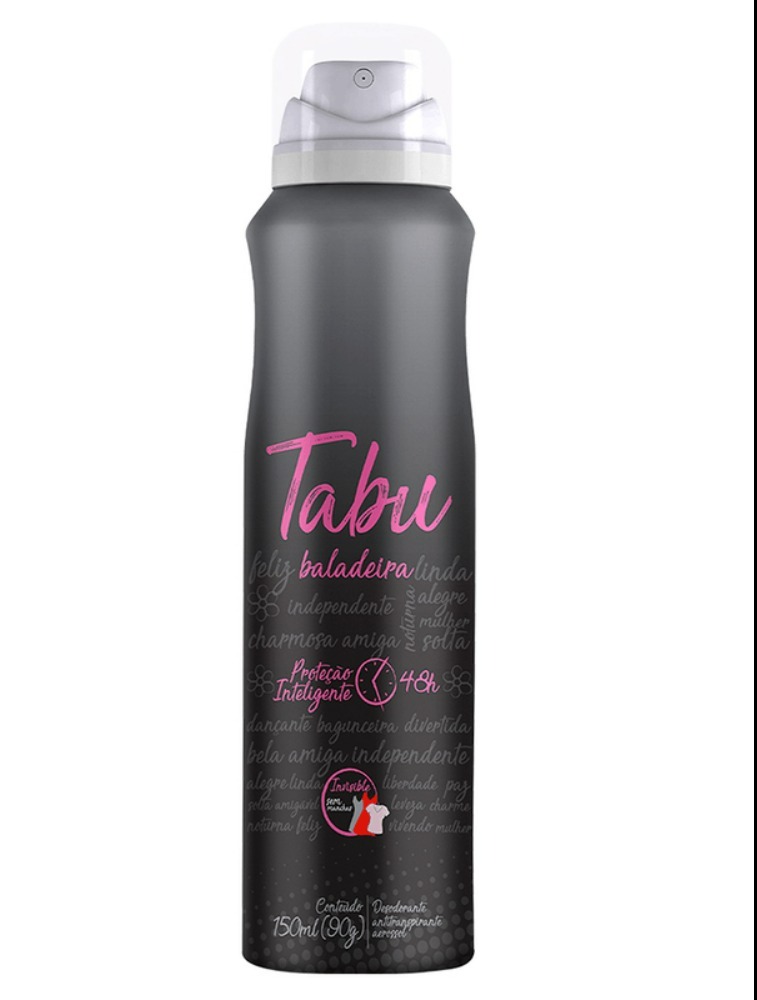 O Desodorante Aerosol Antitranspirante Tabu Baladeira, proporciona agradável toque seco e proteção intensiva perfumada 48 horas de Proteção Inteligente - Axilas secas e perfumadas com ação seletiva contra as bactérias causadoras do mau odor. Mantém o equilíbrio natural da pele.