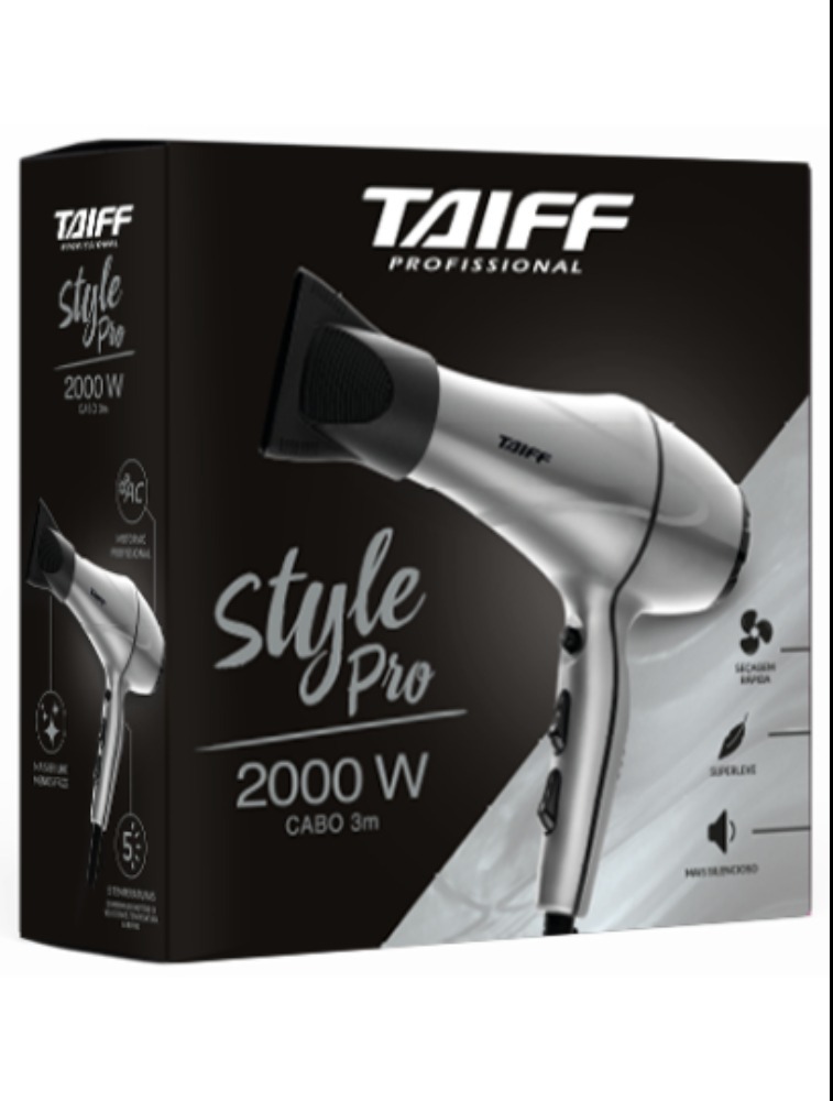 O secador Taiff Style Pro é ideal para uso profissional, pois seu cabo de 3 metros de comprimento proporciona mais liberdade e agilidade para os mais diversos procedimentos e penteados. Permite secagem e modelagem dos cabelos de forma muito mais rápida. Possui motor AC Profissional, silencioso, com maior durabilidade e é superleve. A chave seletora combina temperaturas, velocidades e botão para jato de ar frio, oferecendo 5 temperaturas diferentes. Tem o design arrojado da Linha Style, bico direcionador de ar e a cor Silver combina com todos os ambientes de salões.