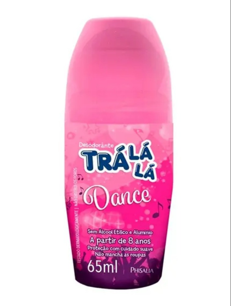 DESODORANTE INFANTIL TRÁ LÁ LÁ DANCE ROLL-ON Linha de desodorantes Trá Lá Lá dermatologicamente testados, desenvolvido especialmente para crianças maiores de 8 anos. Não mancha a roupa. Depois de tomar um banho gostoso com os produtos Trá Lá Lá Kids é hora de passar aquele antitranspirante para manter as axilas bem cheirosas. E isso pode ser feito a partir dos 8 anos. Pensando nisso, a Trá Lá Lá desenvolveu uma fórmula especialmente para essas crianças, o Desodorante Roll-on Dance. Além de ser muito cheiroso, esse desodorante não mancha a roupa nem obstrui os poros da pele. Maravilha, não é mesmo? Não mancha a roupa. Não escurece a pele. Não obstrui os poros. Melhora a hidratação da pele. Sem álcool. Sem alumínio. Testado por Dermatologistas. Modo de usar: Não tem segredo, quer ver? Passe nas axilas secas até sentir um geladinho. Isso é o desodorante líquido que fica dentro do potinho. Depois é só vestir a roupa por cima e pronto!