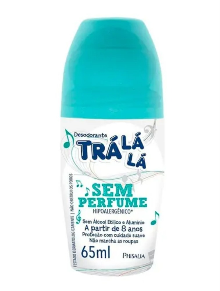 DESODORANTE INFANTIL TRÁ LÁ LÁ ROLL-ON SEM PERFUME Linha de desodorantes Trá Lá Lá dermatologicamente testados, desenvolvido especialmente para crianças maiores de 8 anos. Não mancha a roupa. Depois de tomar um banho gostoso com os produtos Trá Lá Lá Kids é hora de passar aquele antitranspirante para manter as axilas bem cheirosas. E isso pode ser feito a partir dos 8 anos. Pensando nisso, a Trá Lá Lá desenvolveu uma fórmula especialmente para essas crianças, o Desodorante Roll-on Sem Perfume. Além de ser muito cheiroso, esse desodorante não mancha a roupa nem obstrui os poros da pele. Maravilha, não é mesmo? Hipoalergênico. Não mancha a roupa. Não escurece a pele. Não obstrui os poros. Melhora a hidratação da pele. Sem álcool. Sem alumínio. Testado por Dermatologistas. Modo de usar Não tem segredo, quer ver? Passe nas axilas secas até sentir um geladinho. Isso é o desodorante líquido que fica dentro do potinho. Depois é só vestir a roupa por cima e pronto! Precauções: Esse antitranspirante é recomendado para crianças maiores de 8 anos. Não aplicar em pele ferida e irritada. Usar sob orientação de um adulto.