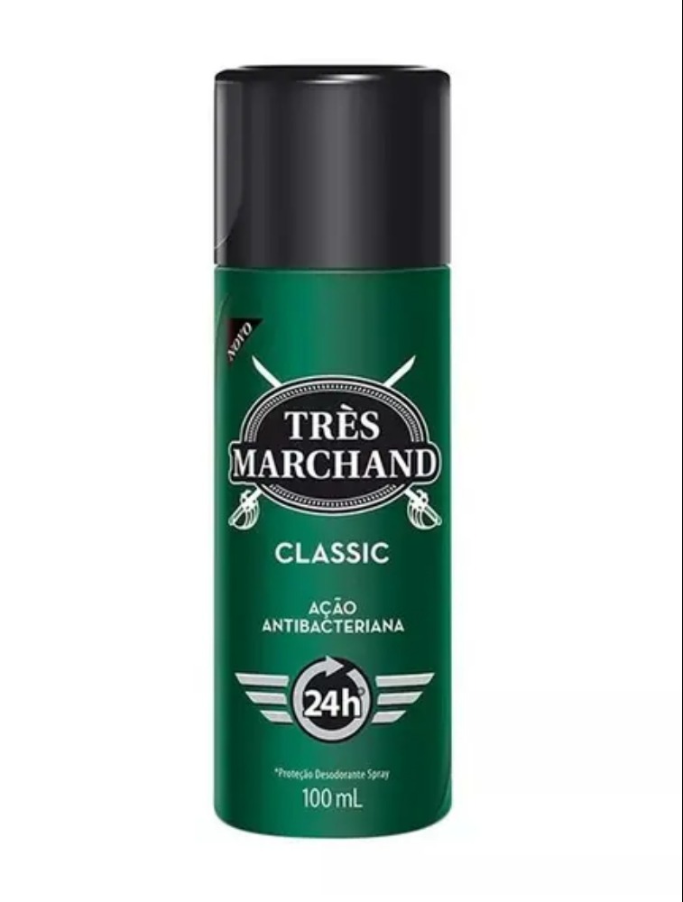 O DESODORANTE SPRAY Três MARCHAND com fragrância Classic promove PROTEÇÃO duradoura para os homens que adoram se cuidar, oferece uma maravilhosa sensação de bem-estar e PROTEÇÃO pelo dia todo. TRÈS MARCHAND tem fragrância marcante que protege contra os odores da transpiração.