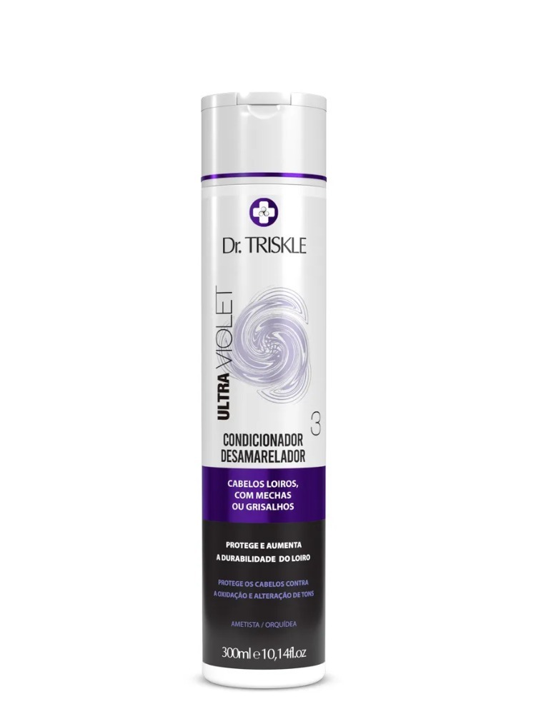 Manter o loiro perfeito e hidratado não é nada fácil, né?! Diversos fatores externos, como sol, piscina, secador, prancha, e até a poluição, deixam os cabelos ressecados e trazem aqueles tons amarelados de volta. Pensando nisso a Triskle desenvolveu a Linha Dr. Triskle Ultra Violet. Sua fórmula exclusiva associa as propriedades restauradoras do BioRestore a 11 aminoácidos poderosos, que agem diretamente na fibra capilar danificada, reestruturando e fortalecendo os fios. Além de seu mix de pigmentos violeta com ação antioxidante, que neutralizam os tons amarelados, deixando os fios com a cor e o brilho desejado.