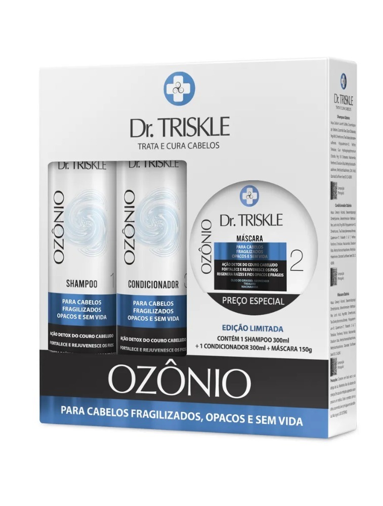 A Dr. Triskle Ozônio uniu o poder do óleo de girassol ozonizado, Trealose e Niacinamida, com Óleo de girassol – rico em vitamina E, C – e minerais que hidratam, minimizam o ressecamento e deixam os fios mais definidos. A Trealose retém água, garantindo hidratação e reconstrução ao fio danificado, devolvendo seu brilho. Já a Niacinamida (Vitamina B3) é um poderoso antioxidante que aumenta o volume e a elasticidade dos fios, melhorando não somente a aparência do cabelo, mas também a textura. Principal ativo da linha, o ozônio combinado ao óleo é um potencializador da ação dos componentes anteriores, fortalecendo e rejuvenescendo os fios, ajudando a eliminar pontas duplas e reduzindo o frizz.