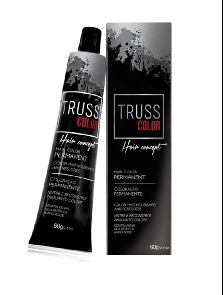 Em um recipiente não metálico, misture 1 medida (60g) de Coloração Permanente Truss para 1 ½ medida (90ml) de Água Oxigenada Truss na volumagem adequada ao resultado desejado (10, 20, 30 ou 40 volumes). Para tons como o 7.0, geralmente utiliza-se água oxigenada de 20 volumes para cobertura de brancos e tom sobre tom, ou 30 volumes para clarear até um tom.