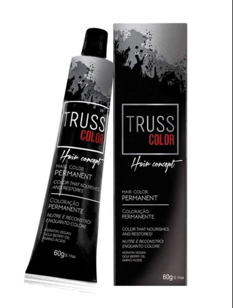 Em um recipiente não metálico, misture 1 medida (60g) de Coloração Permanente Truss para 1 ½ medida (90ml) de Água Oxigenada Truss na volumagem adequada ao resultado desejado (10, 20, 30 ou 40 volumes). Para tons como o 4.0, geralmente utiliza-se água oxigenada de 20 volumes para cobertura de brancos e tom sobre tom, ou 30 volumes para clarear até um tom.
