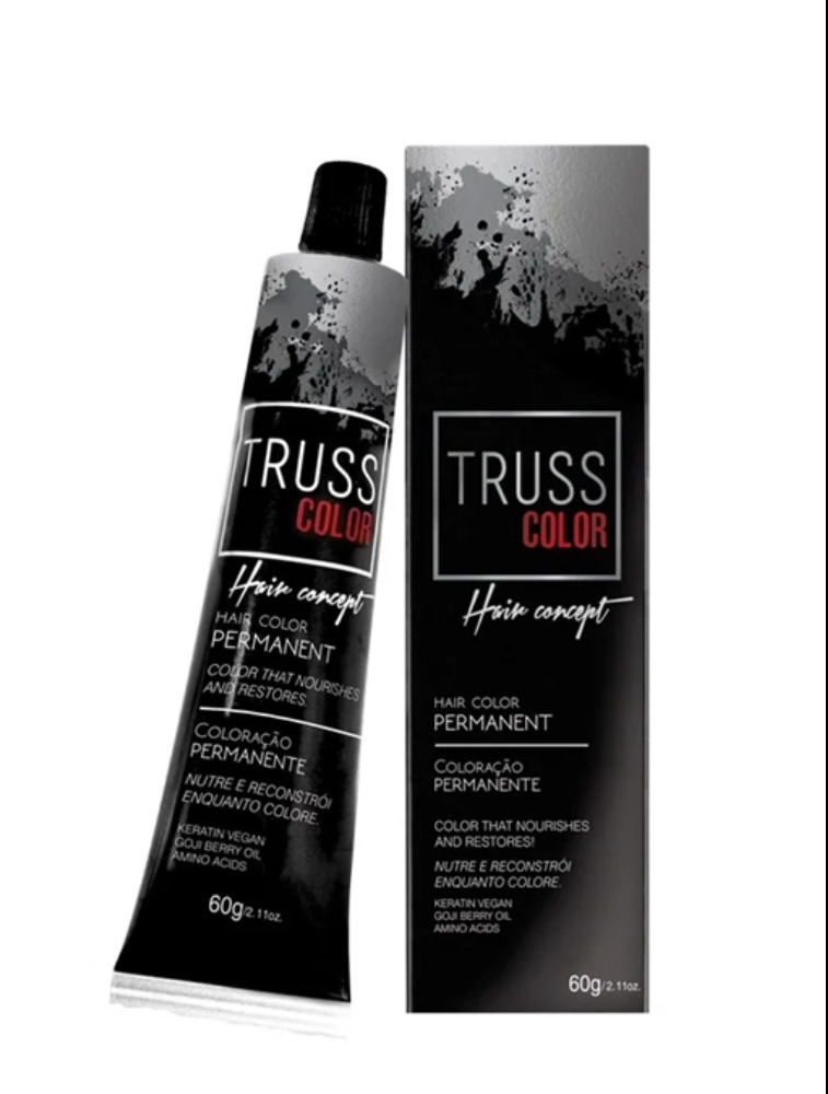 Em um recipiente não metálico, misture 1 medida (60g) de Coloração Permanente Truss para 1 ½ medida (90ml) de Água Oxigenada Truss na volumagem adequada ao resultado desejado (20, 30 ou 40 volumes). Para tons como o 9.0, geralmente utiliza-se água oxigenada de 20 volumes para cobertura de brancos e tom sobre tom, 30 volumes para clarear até dois tons, ou 40 volumes para um clareamento mais intenso, dependendo da cor base.