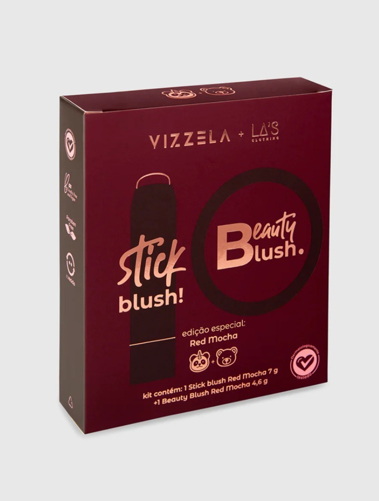 o kit de blushes red mocha contém um stick blush red mocha + 1 beauty blush red mocha, a cor de blush versátil agora em duas texturas, você pode aplicar o stick blush por baixo e o em pó por cima para selar e fazer o seu blush durar o dia todo.