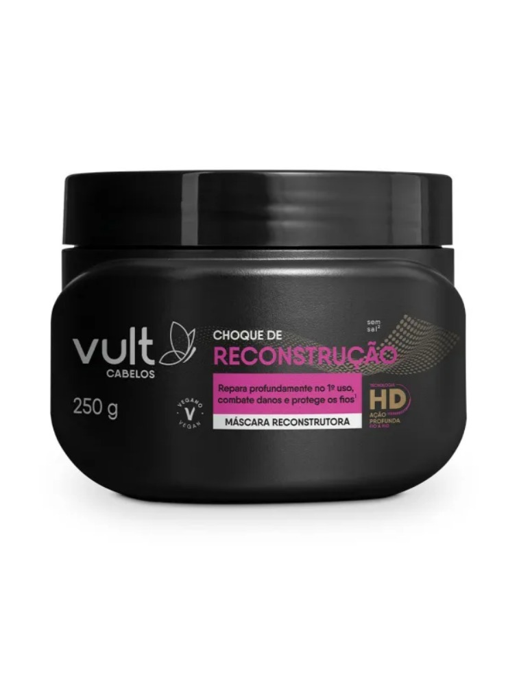 Máscara reconstrutora para cabelos danificados. Vult Cabelos Choque de Reconstrução repara no primeiro uso, combate danos e protege os fios.